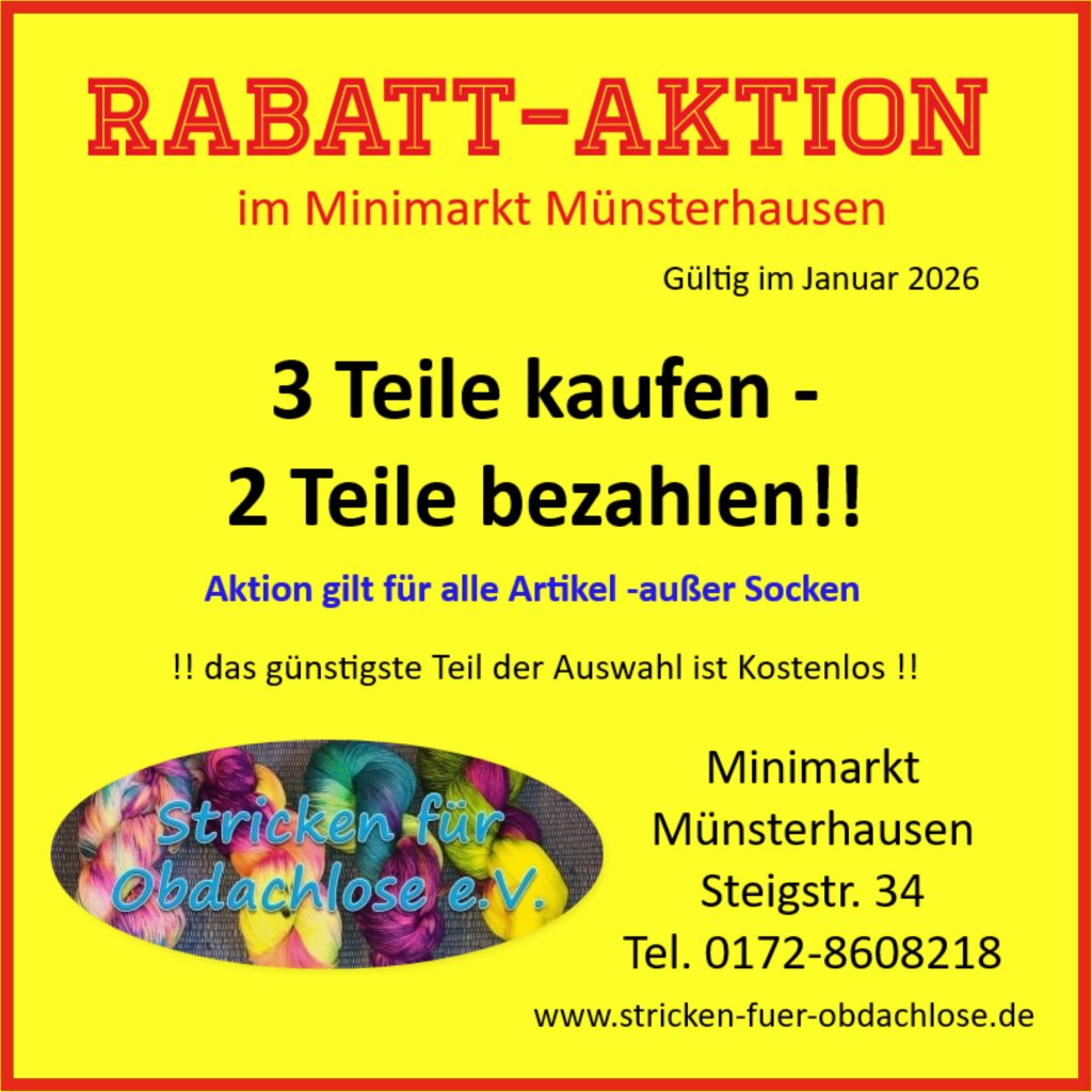 Unsere handgefertigte Unikate werden von Mitte September bis Mitte April im Minimarkt Münsterhausen und bei einigen Veranstaltungen zum Kauf angeboten. Von Mitte April bis September kann unter info@stricken-fuer-obdachlose oder Tel. 0172-8608218 ein Termin zum Einkaufen vereinbart werden. Viele der handgefertigten Stücke finden Sie unter Minimarkt -Shop. Bei Vorkasse und Übernahme der Versandkosten versenden wir unsere gestricken Socken und alle weiteren Handarbeiten auch gerne.