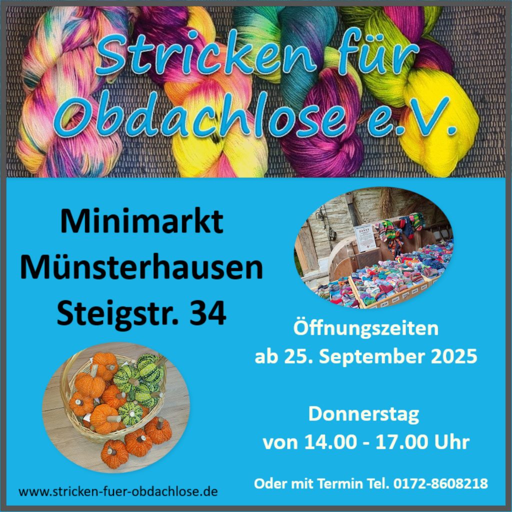 Der Minimarkt von Stricken für Obdachlose e.V. ist von Mitte September bis April geöffnet, von Mai bis August kann mit Termin eingekauft werden. Unter info@stricken-fuer-obdachlose oder der Telefonnummer 0172-8608218 kann auch außerhalb der Öffnungszeiten gerne ein Termin zum Einkaufen vereinbart werden.
